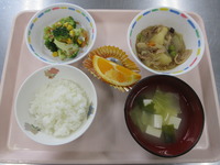 肉じゃが ブロッコリーとコーンのおかか和え みそ汁(わかめ) ごはん オレンジ |