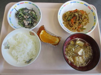 焼きそば 小松菜とひじきのごまマヨ和え かき玉汁 ごはん はっさく |