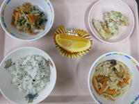 ちくわの磯辺揚げ にんじんのじゃこごま和え 煮込みうどん わかめごはん オレンジ |