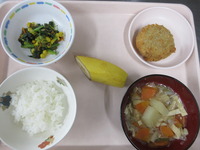 ミンチカツ 春の彩り和え たぬき汁 ごはん バナナ |