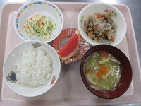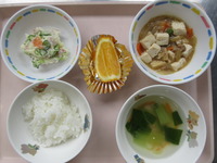 マ-ボ豆腐 ポテトサラダ しめじとチンゲン菜のス-プ ごはん はっさく |