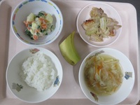 野菜たっぷり豚肉の生姜焼き マカロニサラダ 納豆 はんぺんのすまし汁 ごはん バナナ |