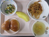 ナポリタン 小松菜サラダ 玉ねぎとベーコンのスープ ロ-ルパン バナナ |