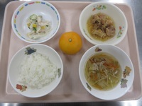 鶏のマ-マレ-ド煮 ツナサラダ ビ-フンス-プ ごはん みかん |