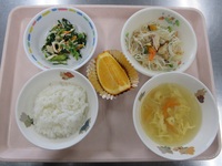 焼きビ-フン ほうれん草とささみの酢和え コ-ン卵ス-プ ごはん はっさく |