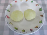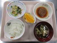 | じゃがいもだんご | ハンバ-グソ-ス煮 小松菜サラダ 若竹汁 ごはん オレンジ |