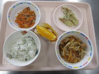 ちくをの磯辺揚げ にんじんのきんぴら 煮込みうどん わかめごはん オレンジ |