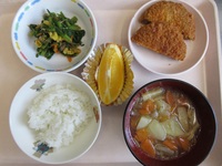 | 塩せんべい | ミンチカツ 春の彩り和え たぬき汁 ごはん オレンジ |