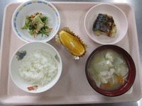 | りんごゼリ- | 焼き鯖 きゃべつとほうれん草の磯和え 豚汁 ごはん オレンジ |