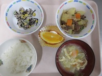 牛肉とじゃが芋の煮物 千切大根とひじきのサラダ みそ汁(キャベツ・揚げ) ごはん オレンジ |