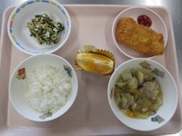 白身フライ ほうれん草の白和え 肉団子ス-プ ごはん はっさく |