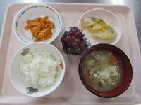 白身魚のクリ-ムコ-ン焼き にんじんのきんぴら 豚汁(夏バ-ジョン) ごはん 納豆 ぶどう |