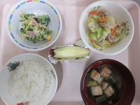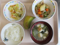 豚肉とキャベツのみそ炒め ブロッコリ-と卵のサラダ 麩のすまし汁 ごはん りんご |