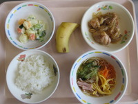 ぎょうざのあんかけ 小松菜とじゃこの和え物 ビ-フンス-プ ごはん バナナ |